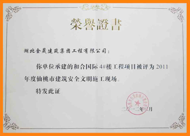 我司承建的和合國際4號(hào)樓工程項(xiàng)目被評為2011年度仙桃市建筑安全文明施工現(xiàn)場
